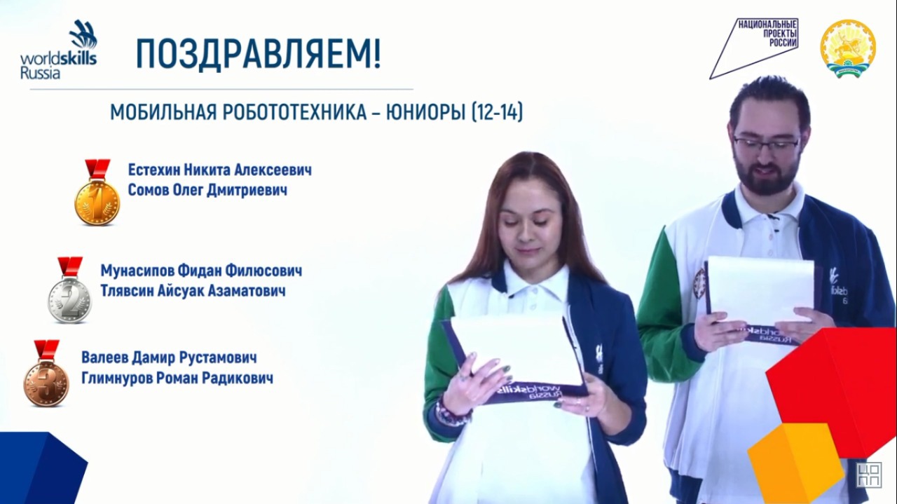по компетенции «Мобильная робототехника» возрастная категория «юниоры» - Мунасипов Фидан (лицей№4), Тлявсин Айсуак(БЛИ) под руководством педагога дополнительного образования СЮТ Султанова Б.Я. заняли II место.