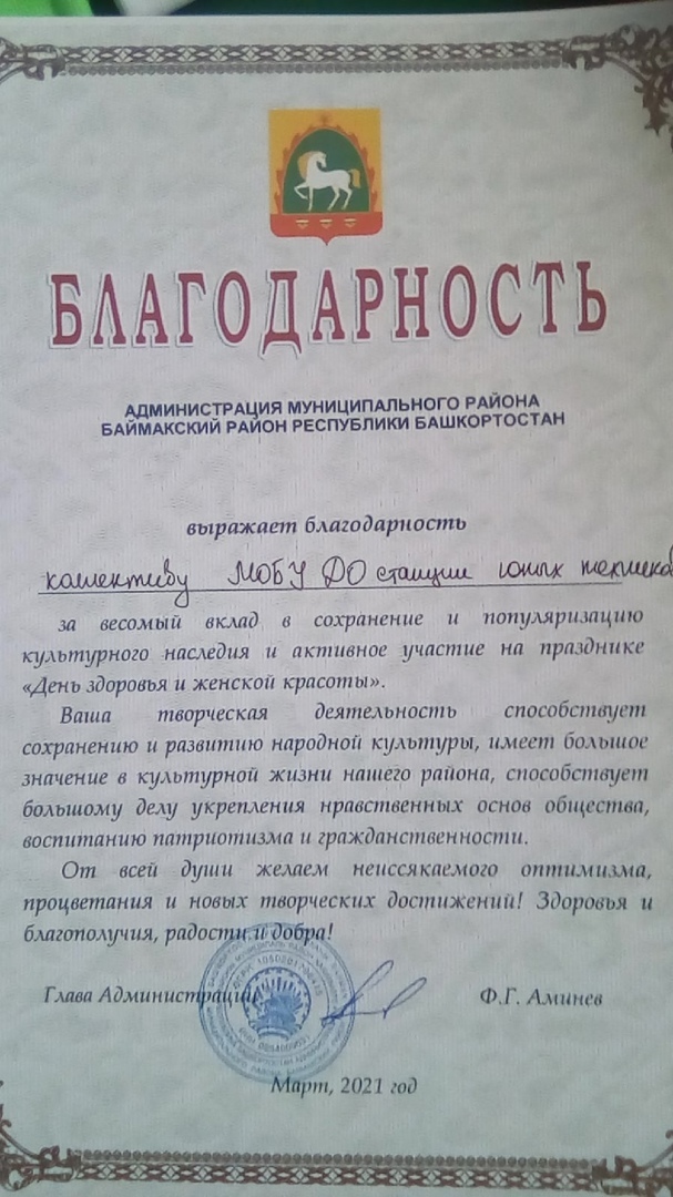 За активное участие на районном мероприятии коллективу МОБУ ДО СЮТ вручена Благодарность Главы Администрации МР Баймакский район.